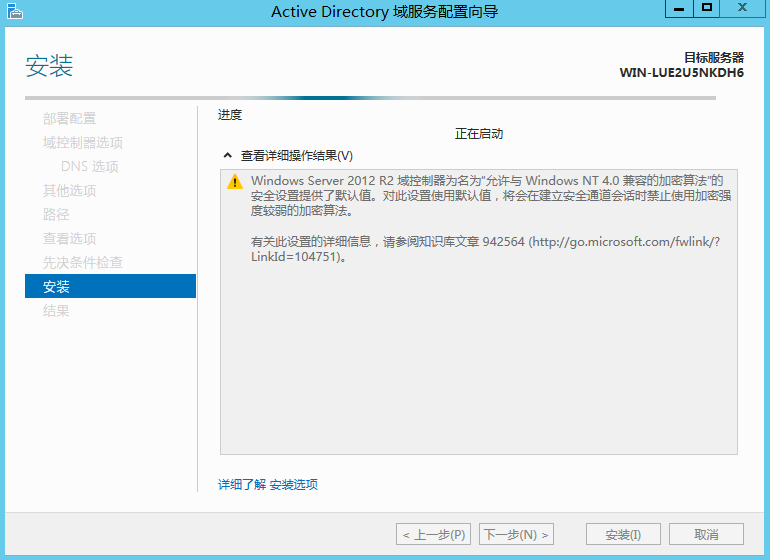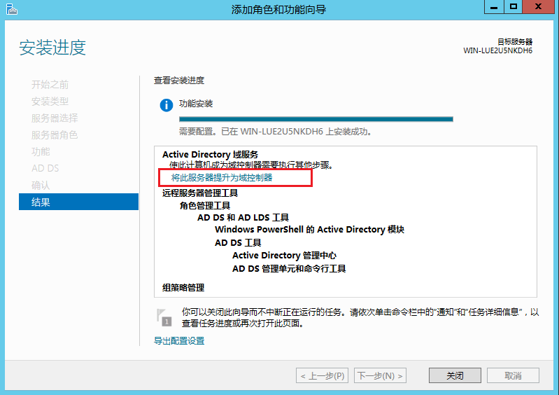 9.“结果”,安装完成结果信息。选择“将此服务器升级为域控制器”
