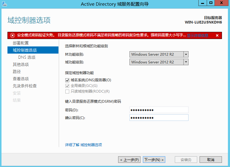 11.“域控制器选项”,键入目录服务模式(DSRM)密码,强密码要求大小写字母、数字和符号组合,完成后点“下一步”