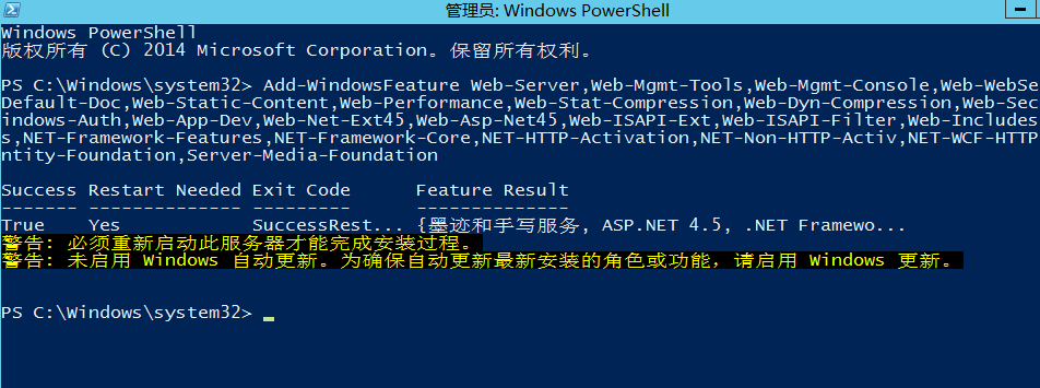 Add-WindowsFeature Web-Server,Web-Mgmt-Tools,Web-Mgmt-Console,Web-WebServer,Web-Common-Http,Web-Default-Doc,Web-Static-Content,Web-Performance,Web-Stat-Compression,Web-Dyn-Compression,Web-Security,Web-Filtering,Web-Windows-Auth,Web-App-Dev,Web-Net-Ext45,Web-Asp-Net45,Web-ISAPI-Ext,Web-ISAPI-Filter,Web-Includes,InkandHandwritingServices,NET-Framework-Features,NET-Framework-Core,NET-HTTP-Activation,NET-Non-HTTP-Activ,NET-WCF-HTTP-Activation45,Windows-Identity-Foundation,Server-Media-Foundation