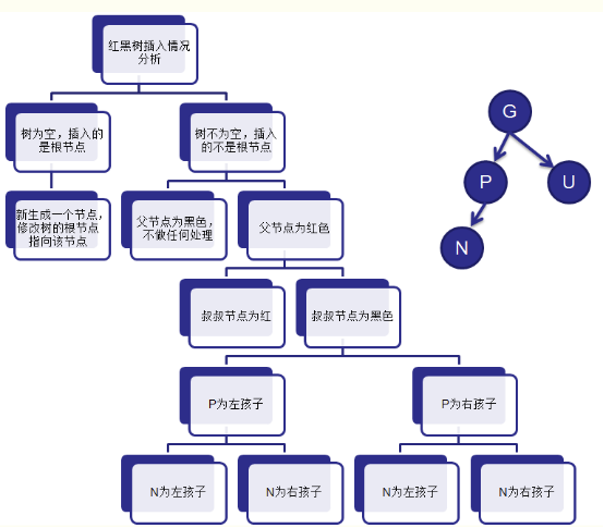 如果新节点的父结点为红色,这时就需要进行一系列操作以保证整棵树红黑性质。如下图所示,由于父结点为红色,此时可以判定,祖父结点必定为黑色。这时需要根据叔父结点的颜色来决定做什么样的操作。青色结点表示颜色未知。由于有可能需要根结点到新点的路径上进行多次旋转操作,而每次进行不平衡判断的起始点(我们可将其视为新点)都不一样。所以我们在此使用一个蓝色箭头指向这个起始点,并称之为判定点。