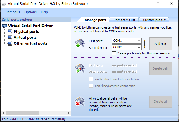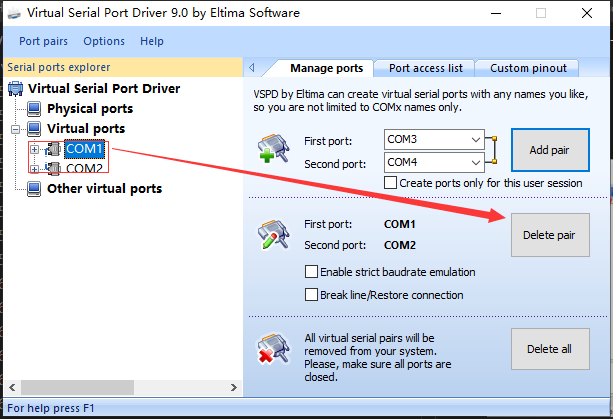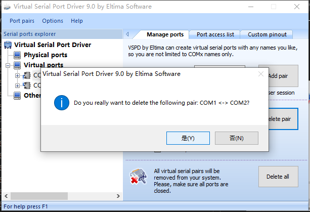 测完了串口后,记得 先在串口调试程序中关闭两个串口,然后在VSPD中删除这对串口。