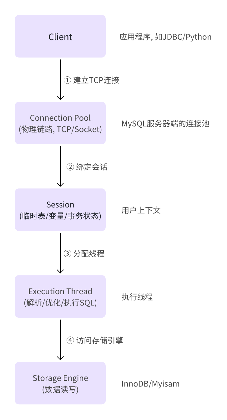一个连接可以包含多个会话,每个会话对应着客户端在连接上进行的不同操作阶段。而每个会话中的具体操作,又会由MySQL服务器分配执行线程来完成。即连接是基础通道,会话是连接上的逻辑操作单元,执行线程是实际执行会话中操作的工作单元,它们相互配合,实现了MySQL客户端与服务器之间的交互。