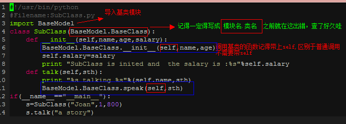 2:在调用基类的方法时,需要加上基类的类名前缀,且需要带上self参数变量。区别于在类中调用普通函数时并不需要带上self参数
