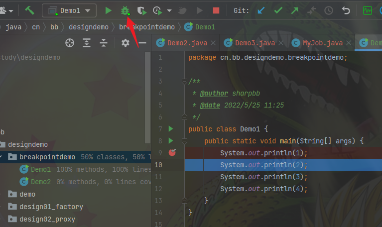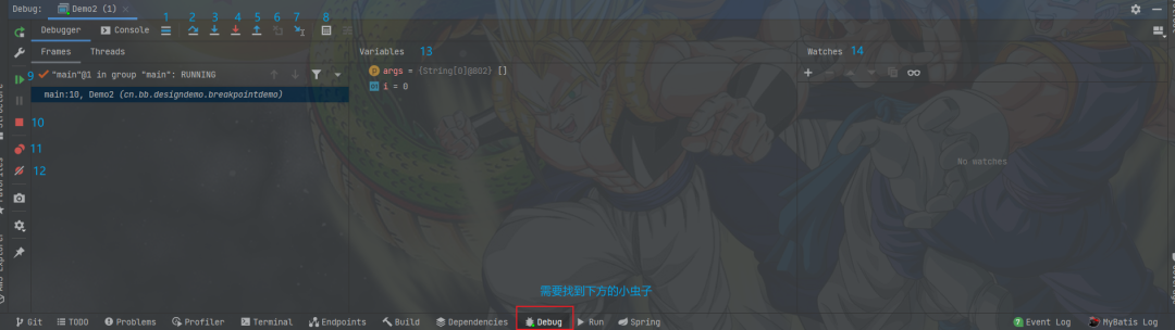 断点调试是很简单的,只需要点击idea上方的小虫子,启动调试即可,如下所示。
