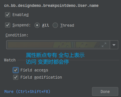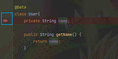 属性断点是打在属性上的,我们无需再getter setter方法上打断点,在属性上打上断点,就会出现一个小眼睛的标志,如下所示。