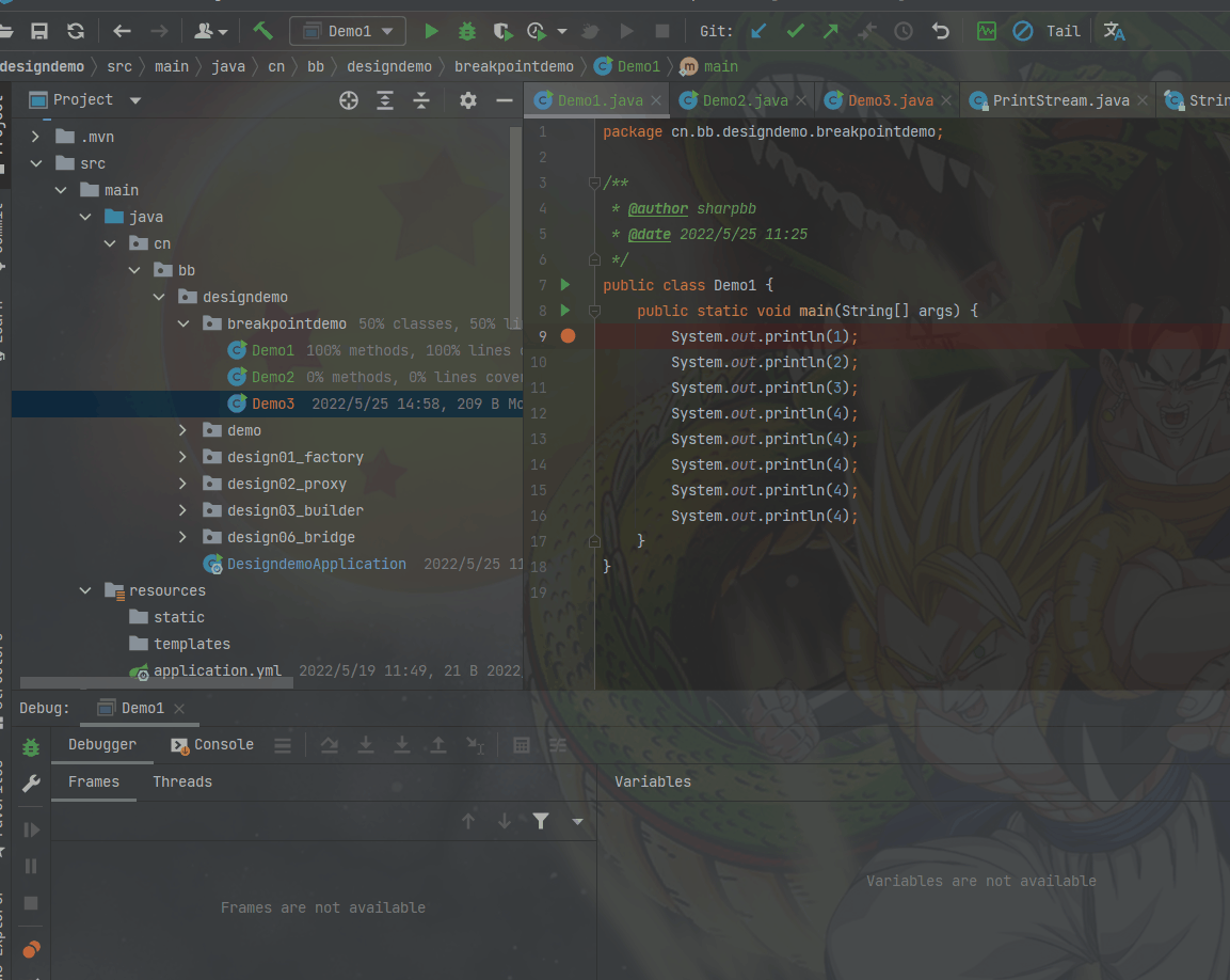 6号按钮是很特殊的,如果你的代码中没有调用其他地方的方法,那么是呈灰色的,无法使用,只有进入更深层的方法,才能够使用,其实就是后悔药,我们很多时候调试时不小心按的快了点,很容易错过想看的位置,只能再次重启吗?不,使用这个drop frame 就可以了,演示如下。