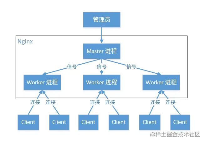 Nginx 启动之后,在 Linux 系统中有两个进程,一个为 master,一个为 worker。master 作为管理员不参与任何工作,只负责给多个 worker 分配不同的任务(worker 一般有多个)。