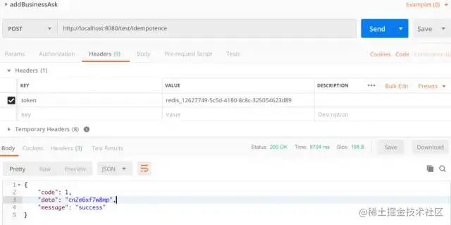 第二次请求,返回到是重复性操作,可见重复性验证通过,再多次请求到时候我们只让其第一次成功,第二次就是失败: