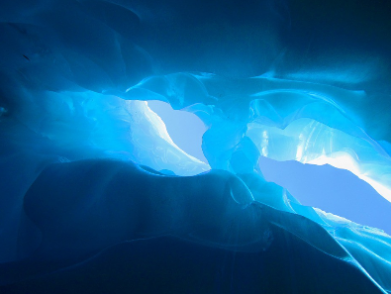 Scatterring,散射,蓝色的天空可以用散射理论解释。在构成冰的空气分子或水分子的尺度上,比光的波长(0.4到0.8 μm之间)小得多的物体(纳米级),散射主要是短波,因此选择了蓝色。 由于瑞利散射,冰洞中的蓝色 。