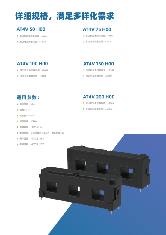 AT4V H00系列霍尔开环电流传感器,通过“抗磁饱和、高速捕捉、强抗干扰、三相集成”四大核心优势,精准破解电梯曳引机电流测量的“磁饱和、峰值捕捉难”痛点,同时满足特种设备的高安全、高可靠要求。无论是新款电梯的配套升级,还是存量电梯的技术改造,AT4V H00都能提供稳定、精准、省心的电流测量解决方案,为电梯平稳运行保驾护航。