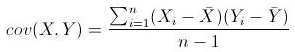 具体计算协方差采用上图公式,注意上边是用随机变量X和Y的n个样本来计算的两个随机变量的协方差,最后除以n-1是为了无偏估计。