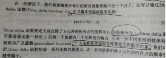 需要注意的是Dirac分布是用来定义概率密度函数的,不是用来定义概率质量函数的,也就是说是针对连续型随机变量才能用Dirac函数来作为其概率密度函数。