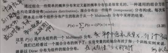 对于经验分布来举例,看作混合分布,则里边的范畴分布有m个状态,每个状态的概率都是1/m,每个从范畴分布中采样得到一个dirac分布,从这个分布产生一个样本点。比如在范畴分布中以1/m的概率采样得到了其中一个组件,δ(x-1),对应的x=1这个样本就是由密度函数为δ(x-1)的这个组件分布产生的。