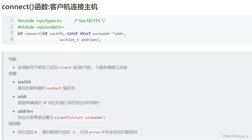 注意:其参数与bind相似,第2参数需强制转换成struct sockaddr *类型