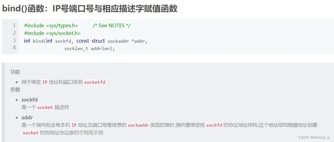 - int bind(int sockfd, const struct sockaddr *addr, socklen_t addrlen);