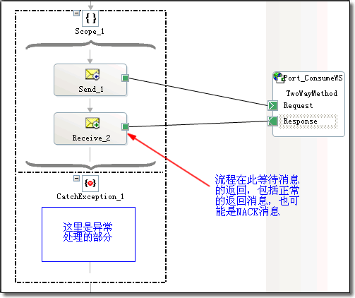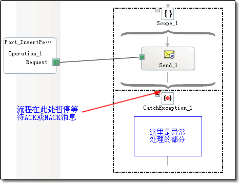 Orchestration的发送端口接收到ACK消息,不做其他的处理,只是使暂停在scope边界处的Orchestration继续往下运行。