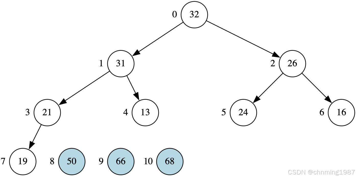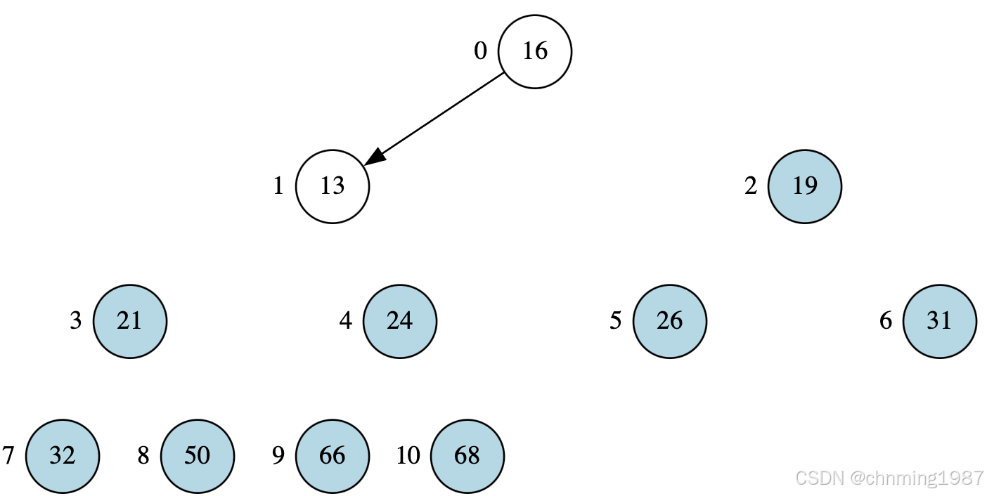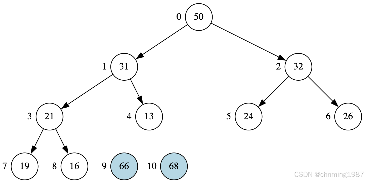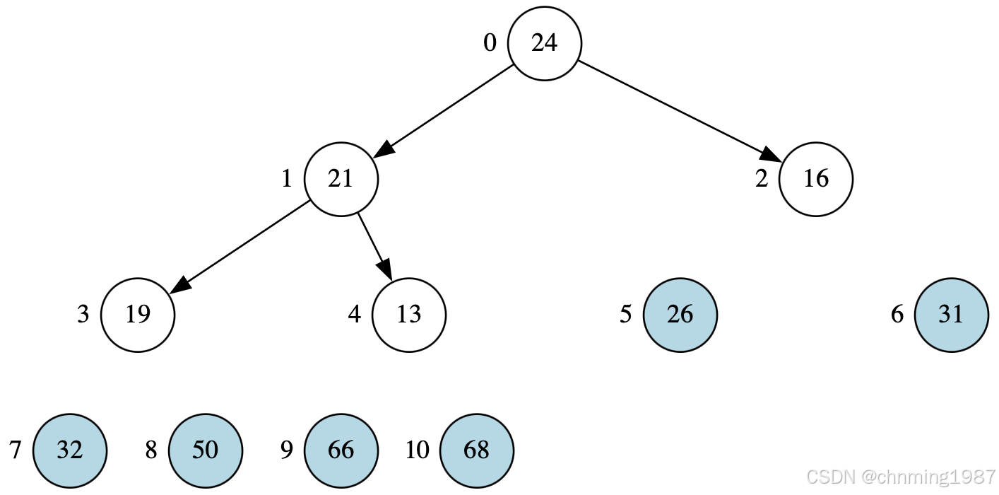 图中,浅蓝色背景的节点为经过pop_heap并置为尾部的节点;