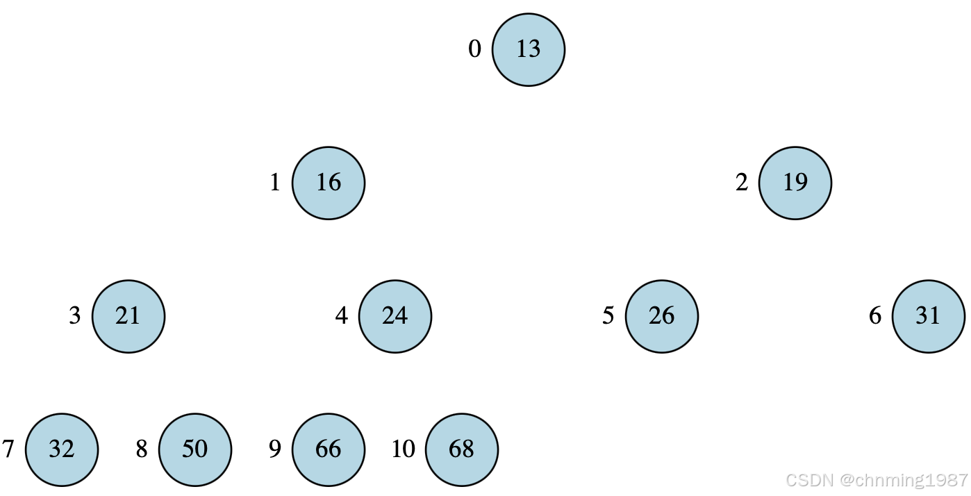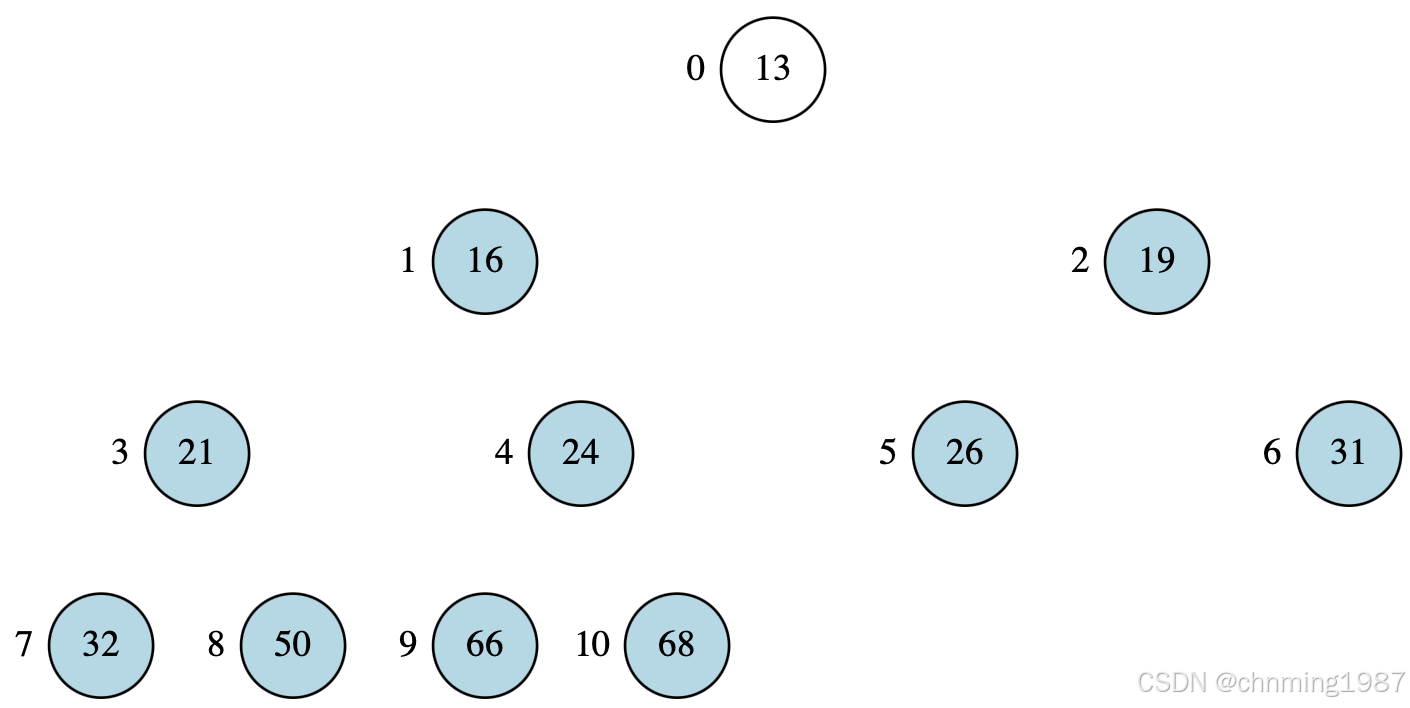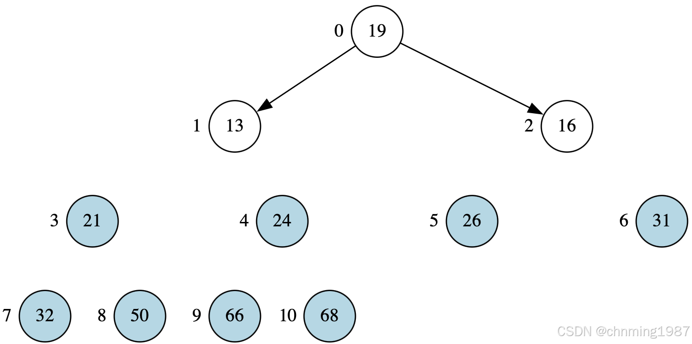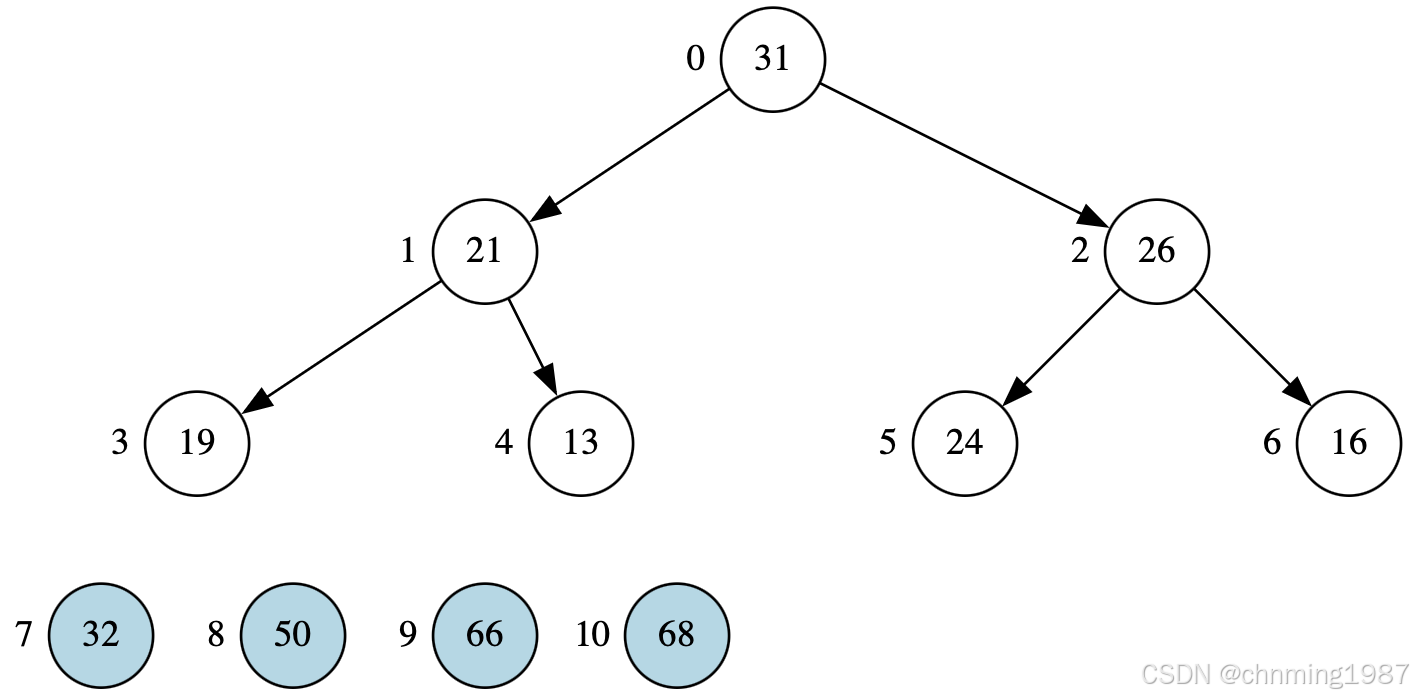 图中,浅蓝色背景的节点为经过pop_heap并置为尾部的节点;