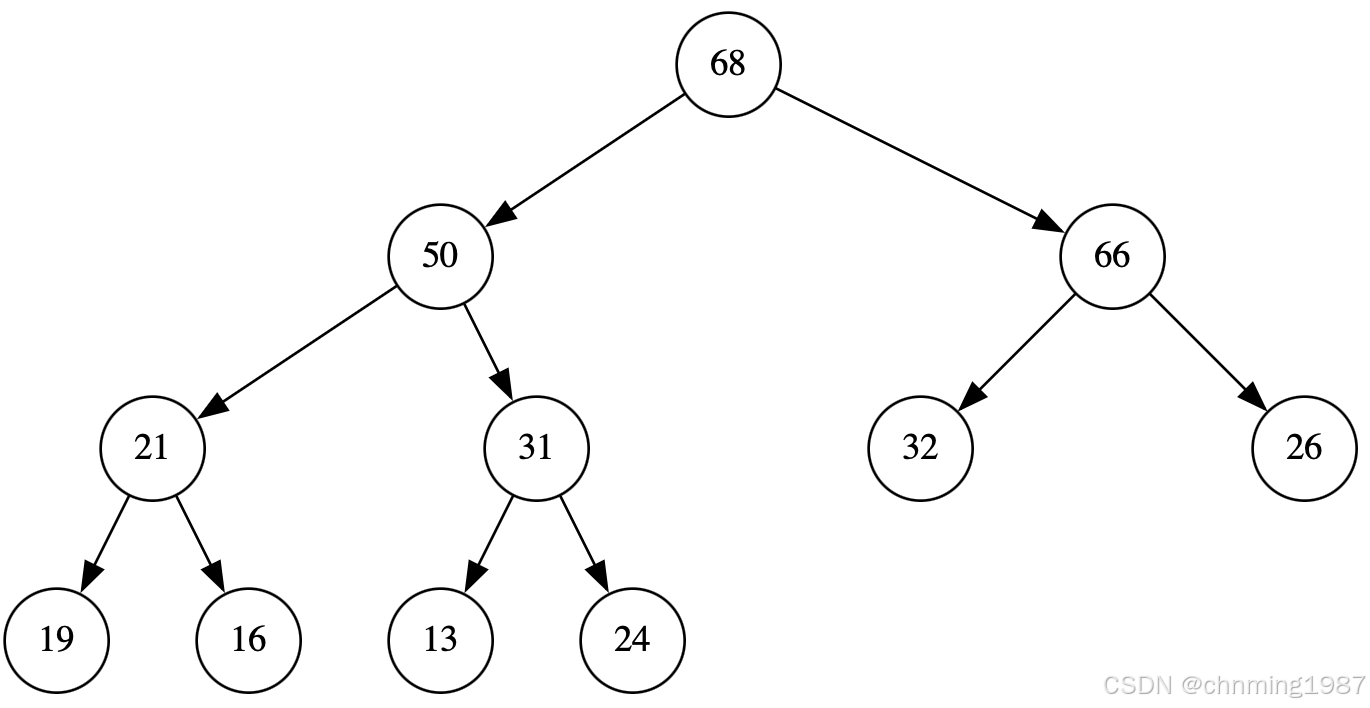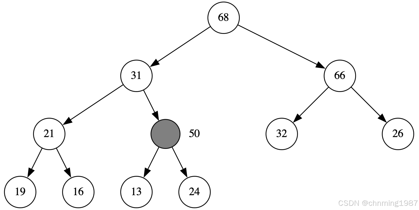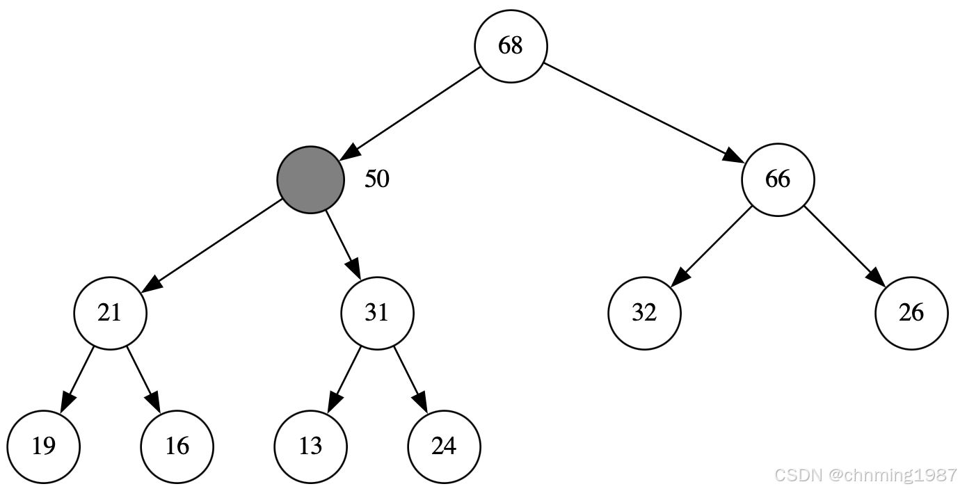 此时因为31比50来得小,所有有执行了一次上溯;而后继续进行上溯,发现父节点的key为68,大于当前节点的key50,所以上溯结束;将50填入当前节点;最终max-heap形如: