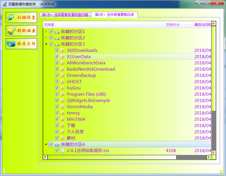 步骤4:软件扫描到资料后,放到《恢复的分区》目录中。