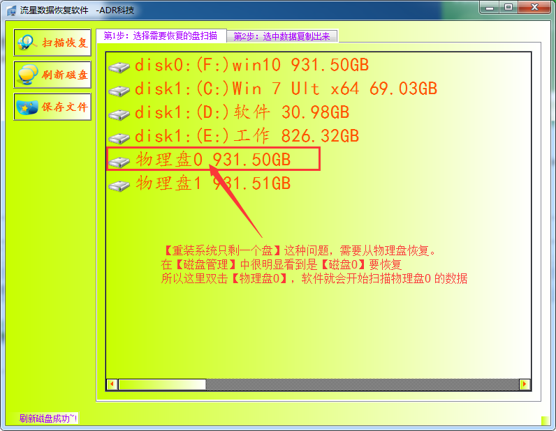 步骤2:程序运行后,直接双击需要恢复的物理盘,重装系统只剩C盘需要从物理盘恢复资料。