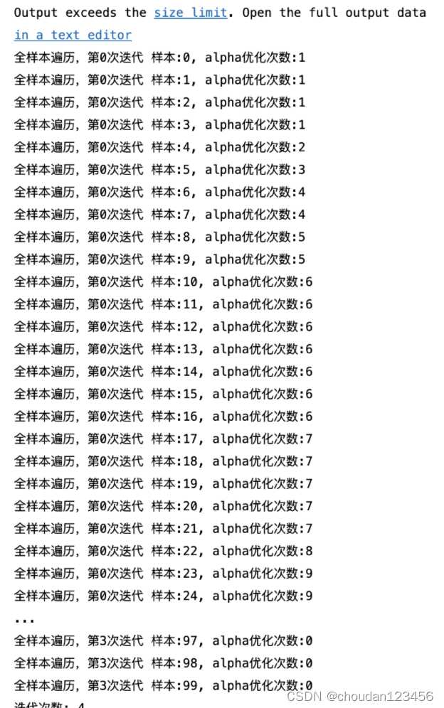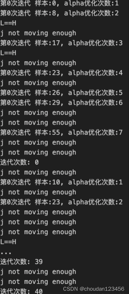 while (iter < maxIter) and ((alphaPairsChanged > 0) or (entireSet)): # 超过最大迭代次数或者遍历整个数据集都alpha也没有更新,则退出循环