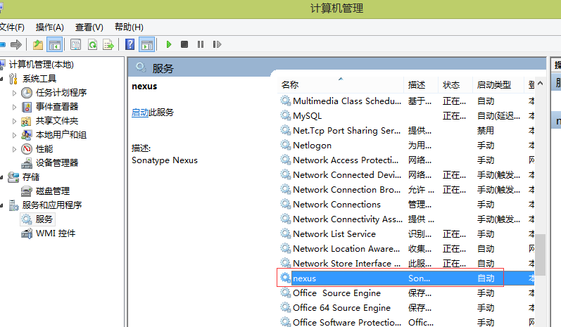 出现以上信息,表示 nexus 启动成功,也可以在服务中直接启动,前提是需要在 dos 中执行 nexus install 或使用 window 的 sc create 命令安装服务。