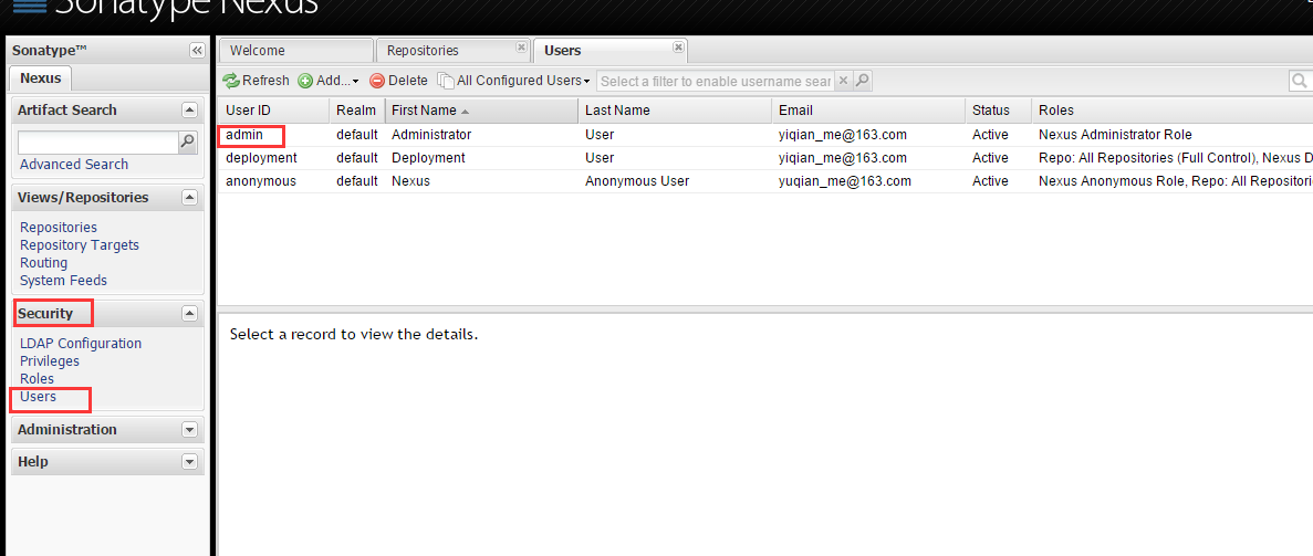先停止 nexus 服务 ,打开 %NEXUS_HOME%\sonatype-work\nexus\conf\security.xml ,nexus 的密码采用 SHA1 加密算法 ( 在线加密工具 ), 将加密后的 SHA1 串拷贝覆盖原来的即可。