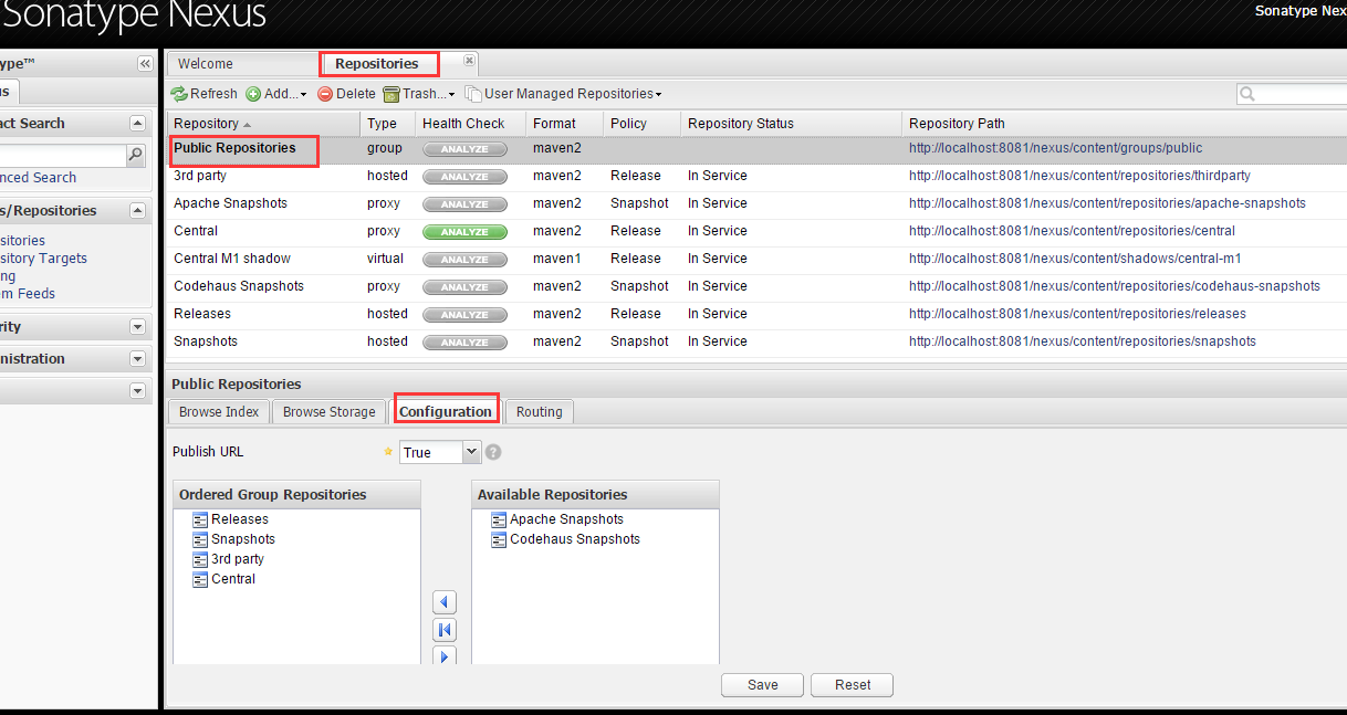上图的configuration 中, 左边的是组仓库 , 右边的是当前可用的仓库 ,从右边选择你想要加入到组的仓库 ,点 save 保存即可 ,组仓库中仓库的顺序是有用的,它决定 maven 获取 构件 时遍历 nexus 仓库的顺序。
