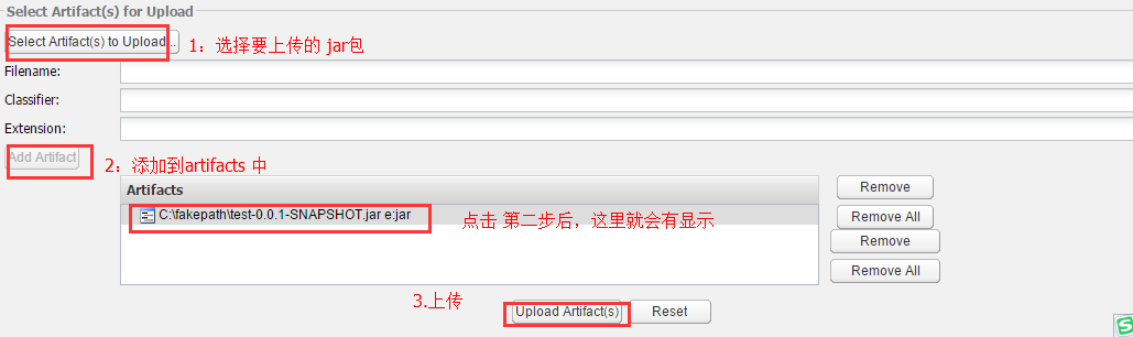 再选择 Select artifact to upload (选择你要上传的jar包文件),选择好后,点击 Add artifict ,可以看到artifacts 中有了你选择的 jar 包,再 点击 upload artifact ,上传成功