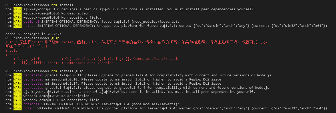 执行npm install gulp -g 安装gulp到全局(必须安装到全局 全局 -g),不然会报错。