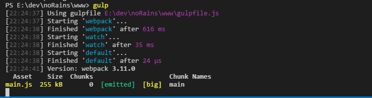上述步骤完成且没有问题之后,成功之后再去执行gulp命令吧,如图我将www下面的src文件夹下面的所有东西都打包到了根目录下的src文件夹的mian.js文件里面: