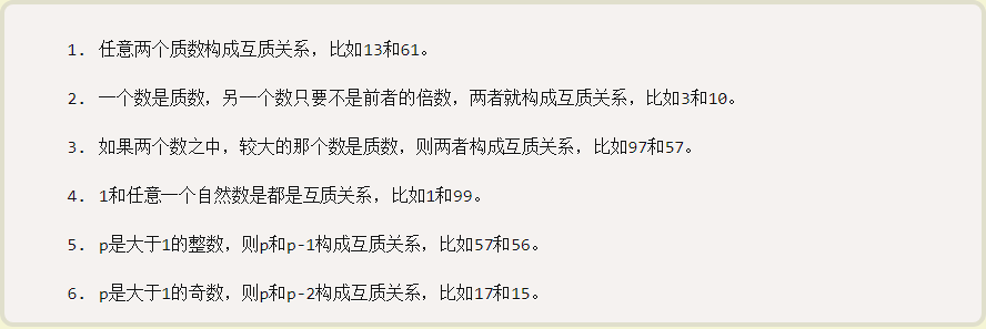 如果两个正整数除了1以外,没有其他公因子,则两者为互质关系。如 15 和 32 、 3 和 7