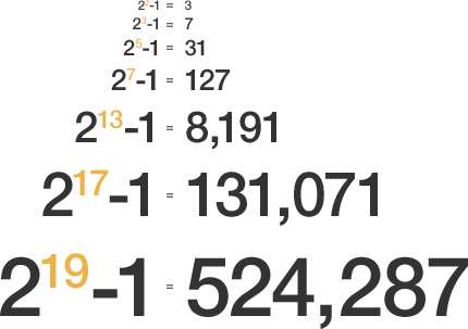 17世纪时,法国修道士梅森(Marin Mersenne)提出了一个质数计算公式:2^n - 1,称为梅森公式。符合该公式的质数,就称为梅森质数,如下图:
