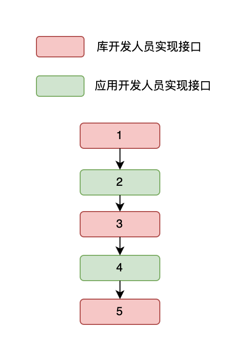 这里给出的 demo 的图示如上,假设这里算法的实现主题有 5 个接口,其中红色的 1,3,5 都是库开发人员已经写好了的接口,2,4 则是由应用开发人员来完成。这里就有如下两种实现方式: