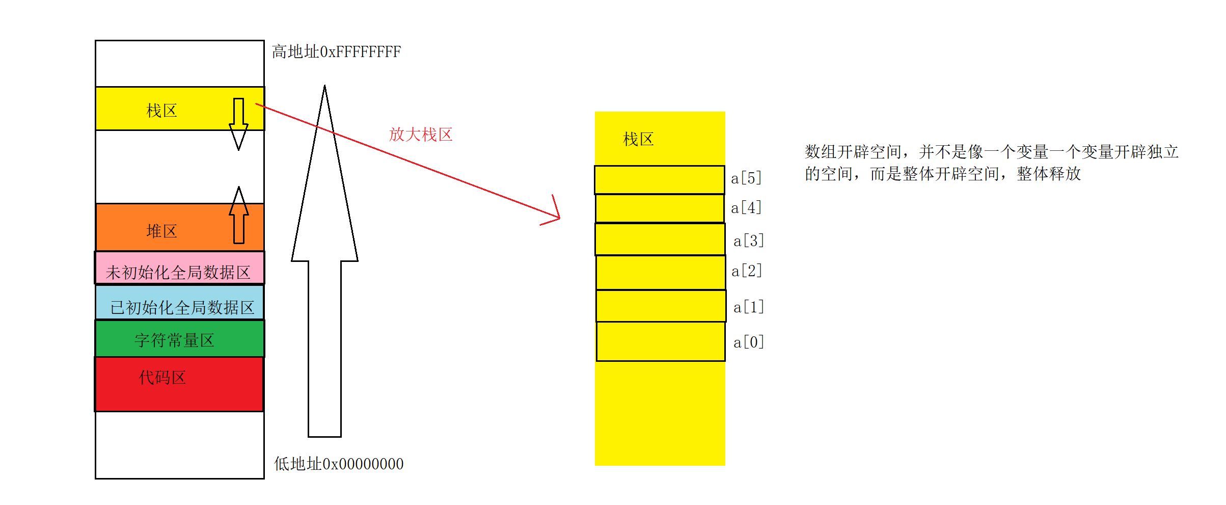 数组是整体申请空间的,整体开辟空间,整体释放。然后将地址最低的空间,作为a[0]元素