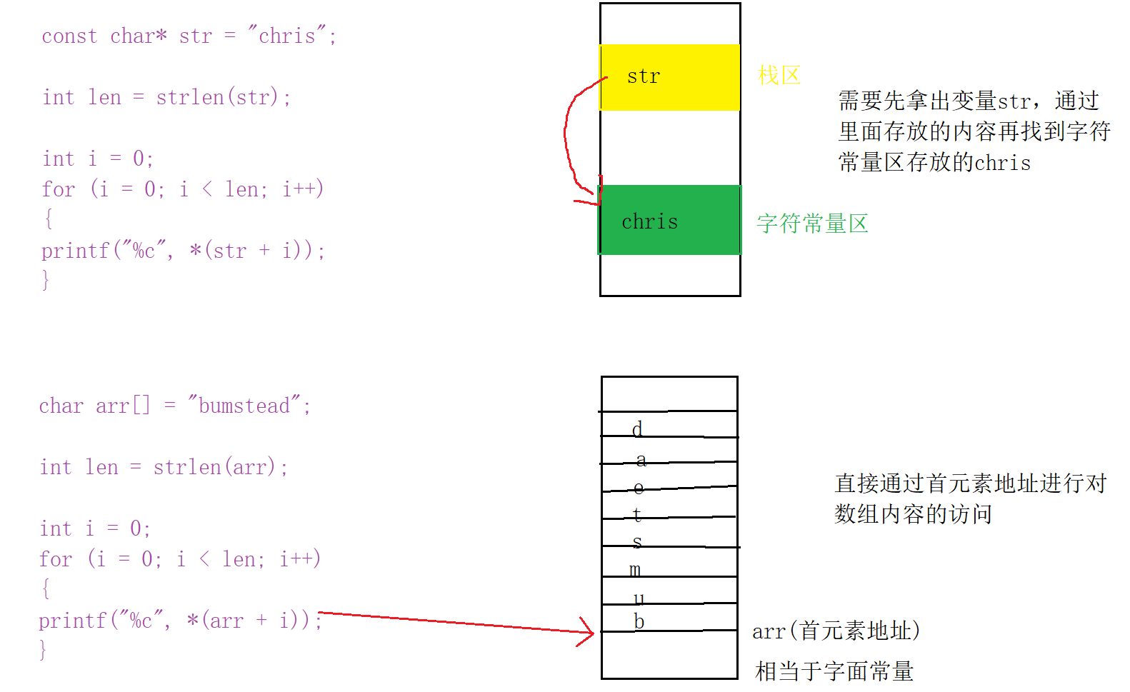char arr[] = "bumstead"并没有单独为数组名开辟一块空间,数组名就代表首元素的地址(只有两种情况代表整个数组)。如果要访问b,只需要找到arr(首元素地址),就可以找到b;如果要找到u,只要找到arr,然后+1,指向下一个地址,就可以找到u,看出来这里的数组名可以看成一个字面常量,直接拿地址找到我们想找到的字符