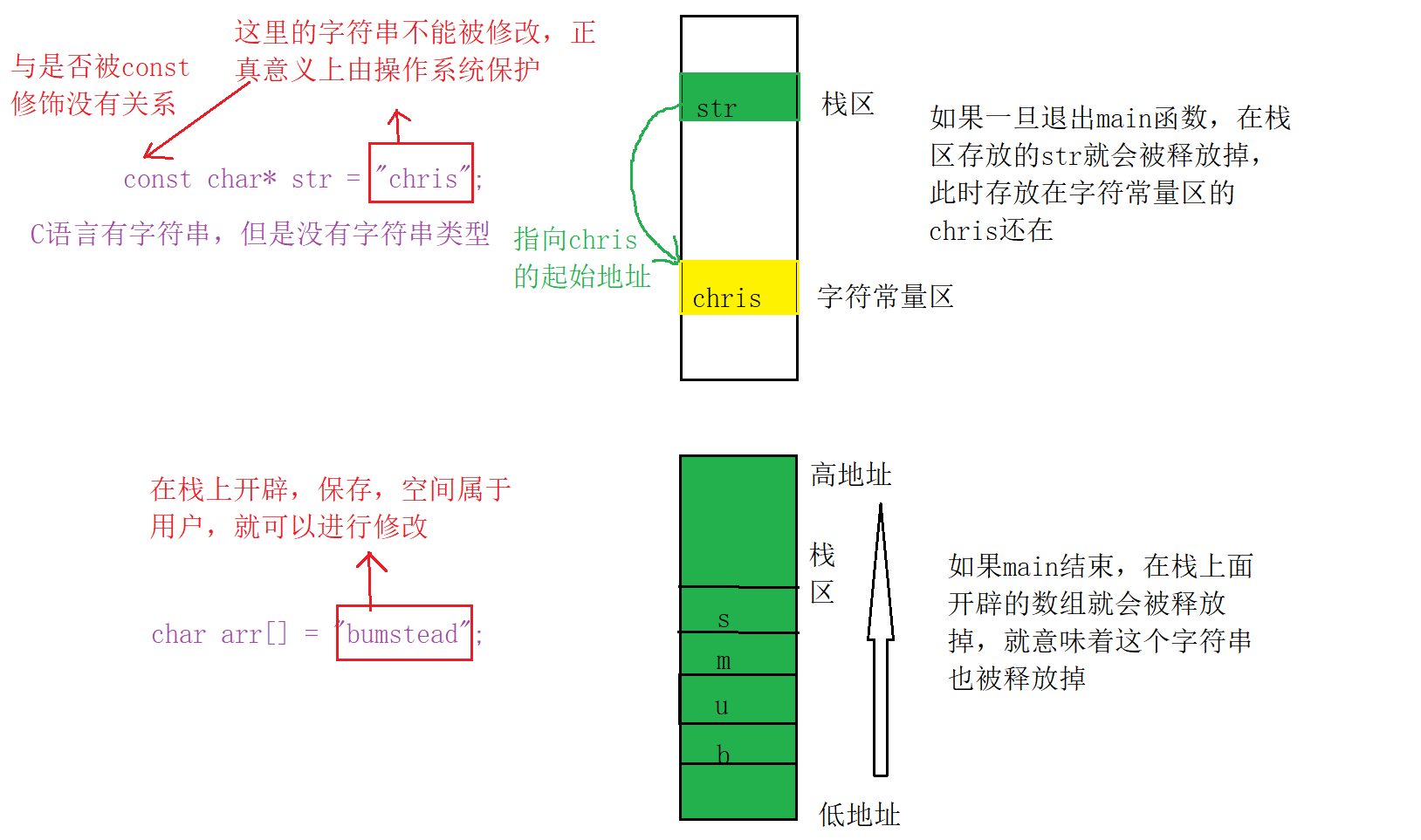 const char* str = “chris”;这是现在栈上面开辟了一块空间用来保存变量str,在字符常量区开辟空间用来存放chris。如果要找到c,通过str可以找到;如果要找到h,通过str+1可以找到。我们得先找到str,拿出里面的内容,然后再找到对应的字符