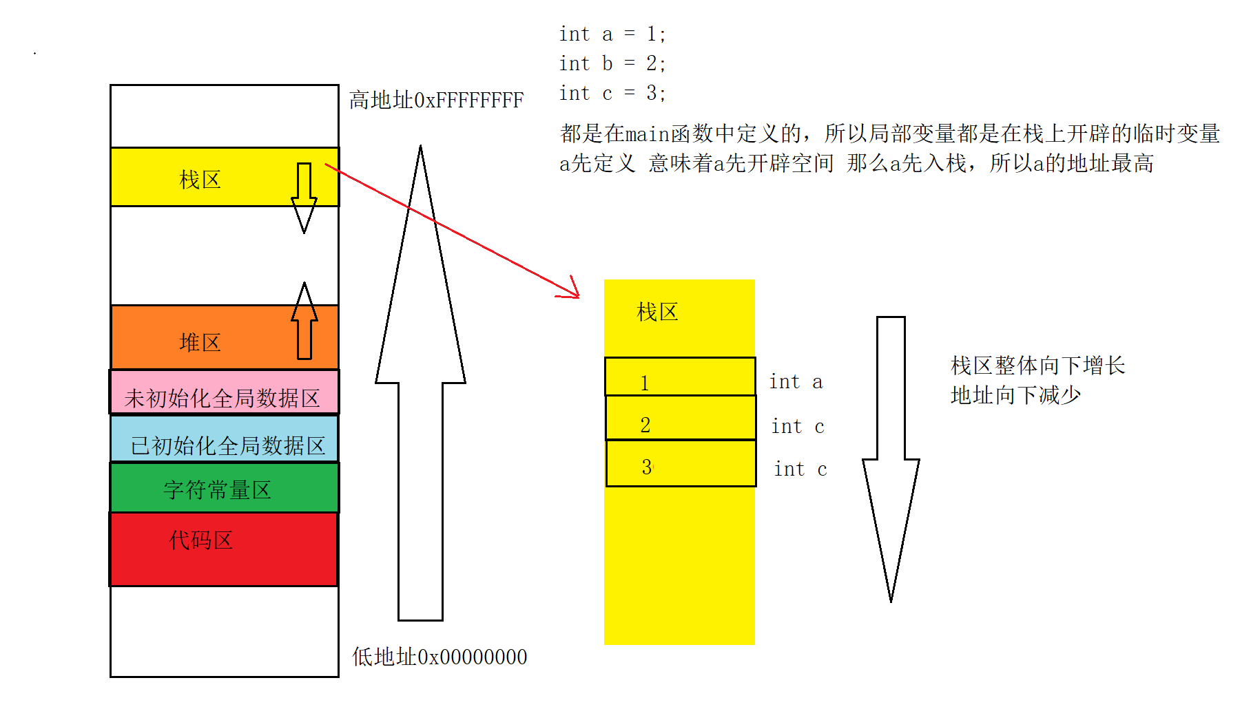 在main函数中进行变量的定义,都是在栈上开辟的临时空间