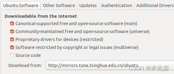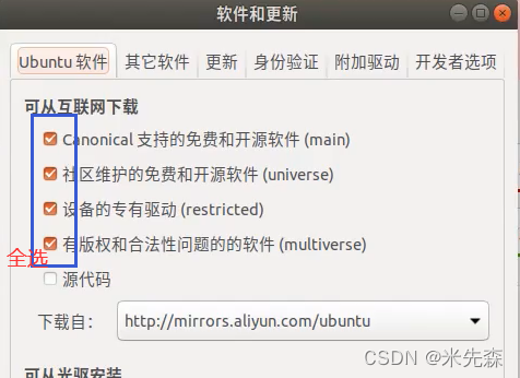 打开 “ 软件和更新 ”, 确认四个打对钩,然后关掉。