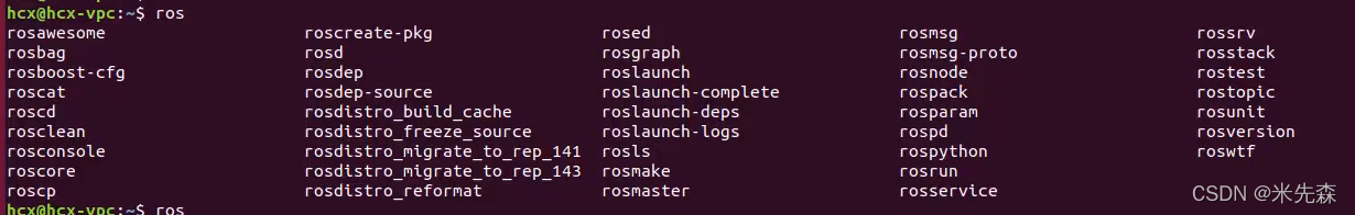 输入ros 查看一下,上面的环境变量设置成功,会看到下面的命令,否则看不到。