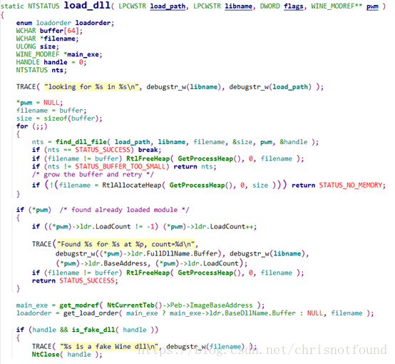 首先,load_dll需要确定是否能找到需要装载的dll,并且该dll是否已经被装入,即调用find_dll_file。后者会根据进程参数块(ppb)中指定的各个路径,去查找是否有该dll的文件。如果找到,那么pwm就不为空,说明该dll已经被装入,不必再重复装载,返回即可。