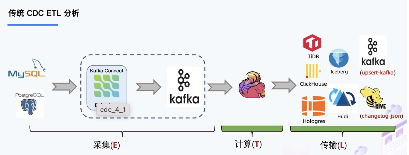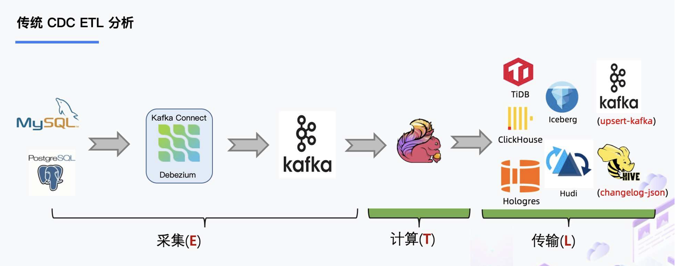 我们来看下传统 CDC 的 ETL 分析链路,如下图所示: