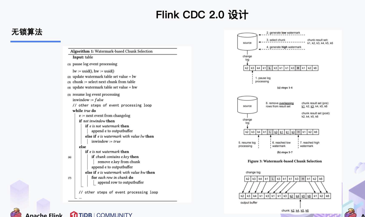 Netflix 的 DBLog 论文中 Chunk 读取算法是通过在 DB 维护一张信号表,再通过信号表在 binlog 文件中打点,记录每个 chunk 读取前的 Low Position (低位点) 和读取结束之后 High Position (高位点) ,在低位点和高位点之间去查询该 Chunk 的全量数据。在读取出这一部分 Chunk 的数据之后,再将这 2 个位点之间的 binlog 增量数据合并到 chunk 所属的全量数据,从而得到高位点时刻,该 chunk 对应的全量数据。