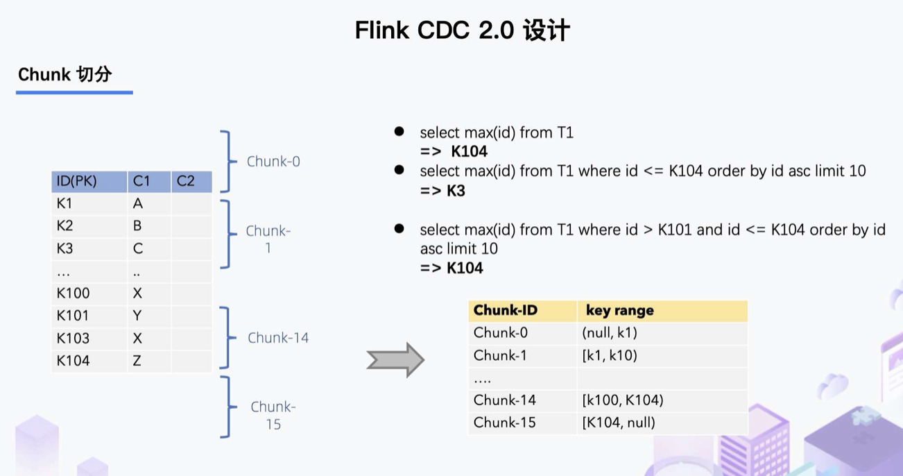 右边是每个 Chunk 的无锁读算法描述,该算法的核心思想是在划分了 Chunk 后,对于每个 Chunk 的全量读取和增量读取,在不用锁的条件下完成一致性的合并。Chunk 的切分如下图所示: