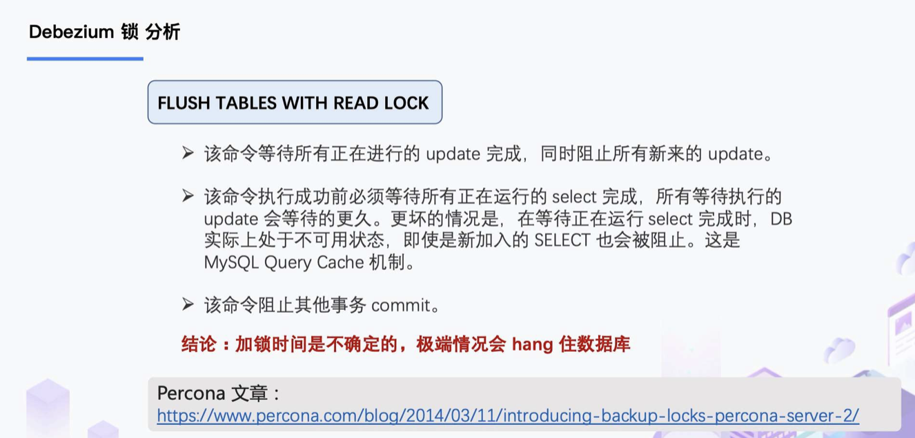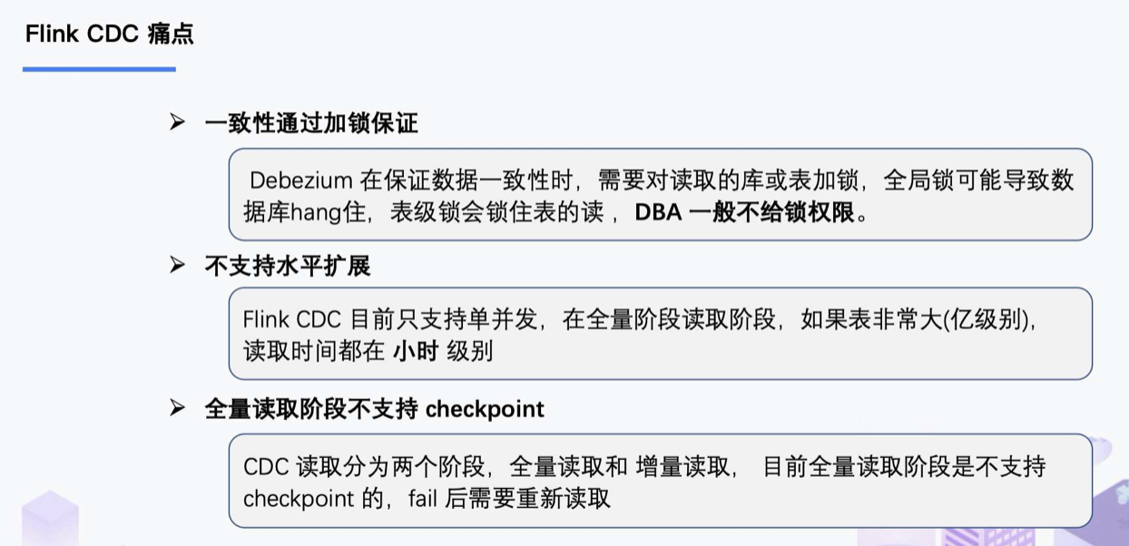 - 全量 + 增量读取的过程需要保证所有数据的一致性,因此需要通过加锁保证,但是加锁在数据库层面上是一个十分高危的操作。底层 Debezium 在保证数据一致性时,需要对读取的库或表加锁,全局锁可能导致数据库锁住,表级锁会锁住表的读,DBA 一般不给锁权限。