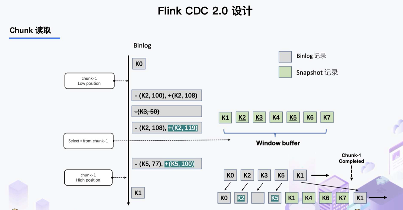 观察图片中右下角最终的输出,会发现在消费该 chunk 的 binlog 时,出现的 key 是k2、k3、k5,我们前往 buffer 将这些 key 做标记。
