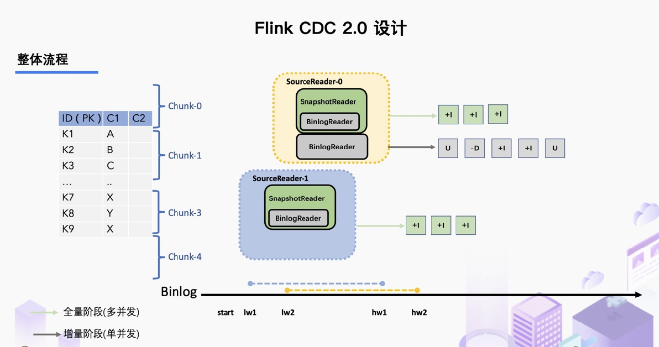 整体流程可以概括为,首先通过主键对表进行 Snapshot Chunk 划分,再将 Snapshot Chunk 分发给多个 SourceReader,每个 Snapshot Chunk 读取时通过算法实现无锁条件下的一致性读,SourceReader 读取时支持 chunk 粒度的 checkpoint,在所有 Snapshot Chunk 读取完成后,下发一个 binlog chunk 进行增量部分的 binlog 读取,这便是 Flink CDC 2.0 的整体流程,如下图所示:
