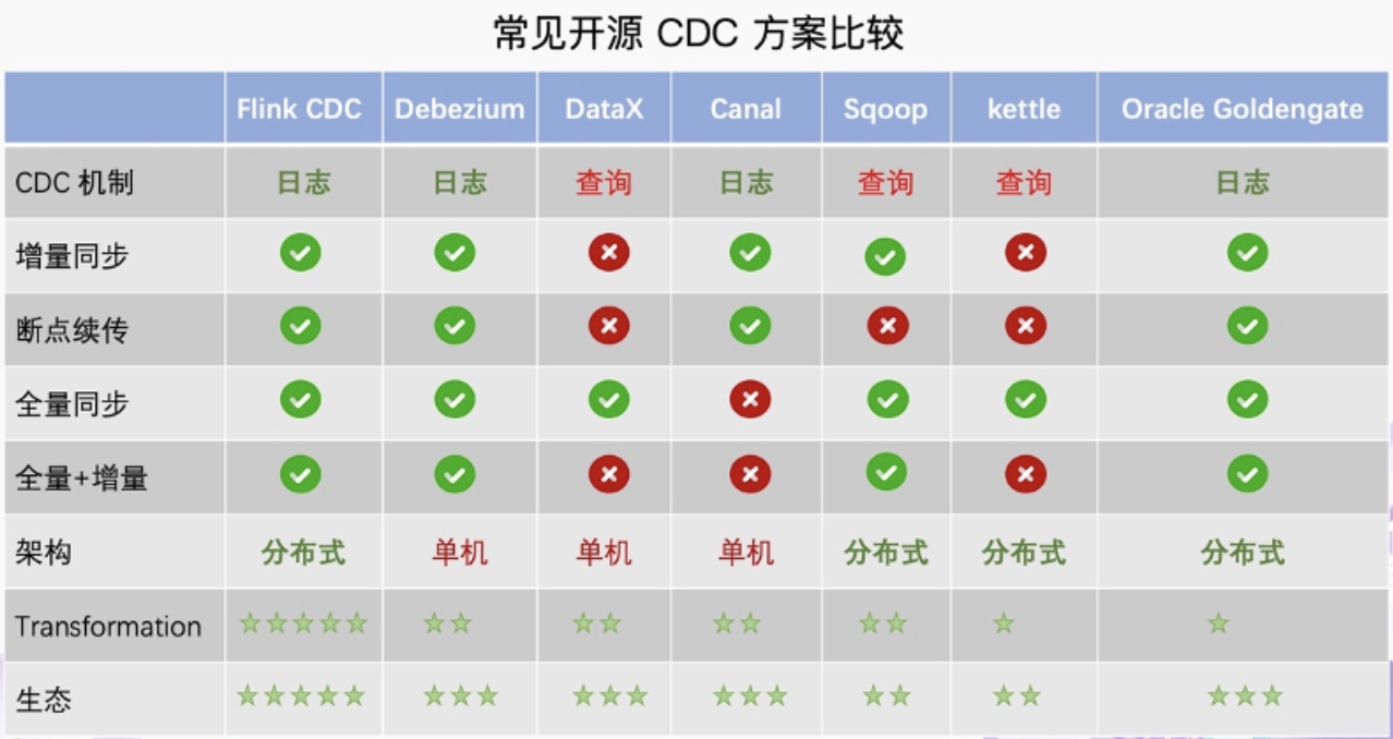 而对比全量 + 增量同步的能力,只有 Flink CDC、Debezium、Oracle Goldengate 支持较好。