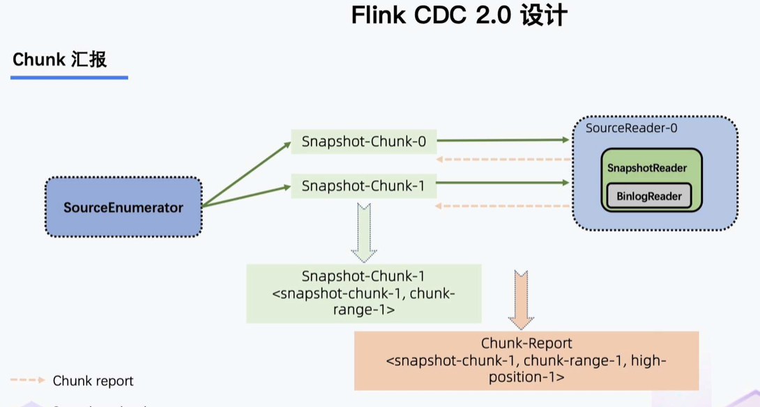 当 Snapshot Chunk 读取完成之后,需要有一个汇报的流程,如下图中橘色的汇报信息,将 Snapshot Chunk 完成信息汇报给 SourceEnumerator。